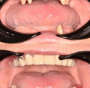 Устанавливается несъемный протез на 4 или 6 имплантатах, который не нужно снимать, а можно полноценно жевать и улыбаться.